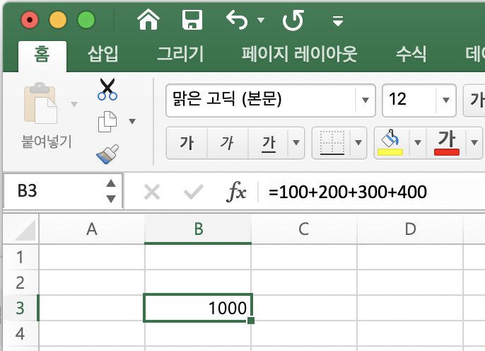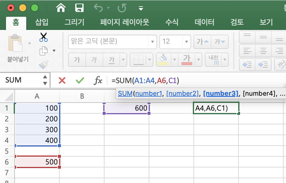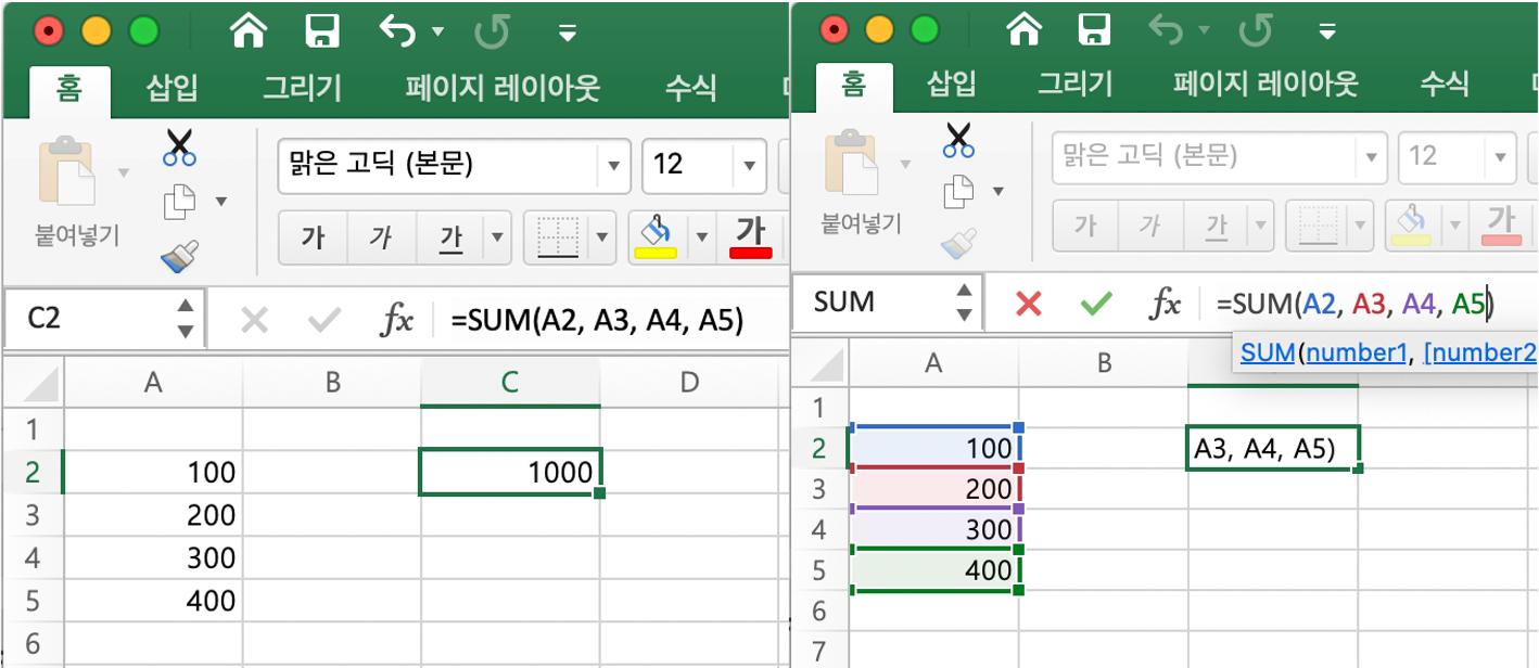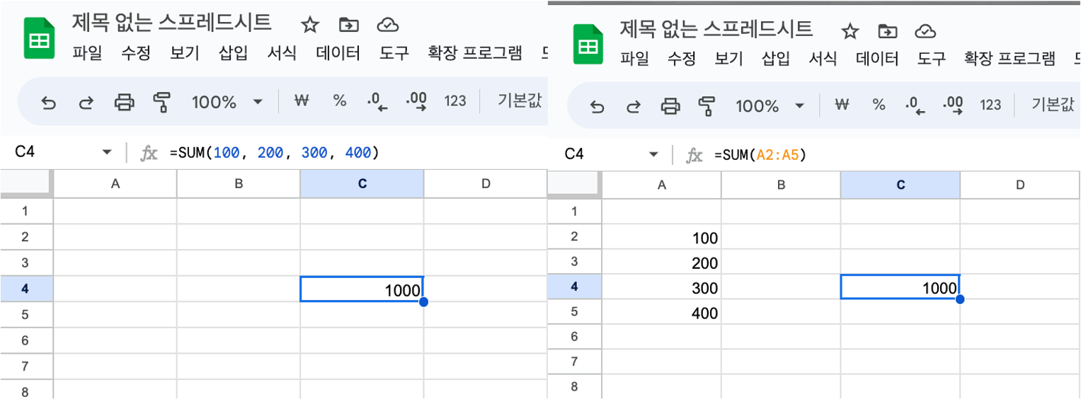 단순히 =SUM(100, 200, 300, 400) 처럼 입력해도 되지만 그러면 함수를 사용했다 뿐이지