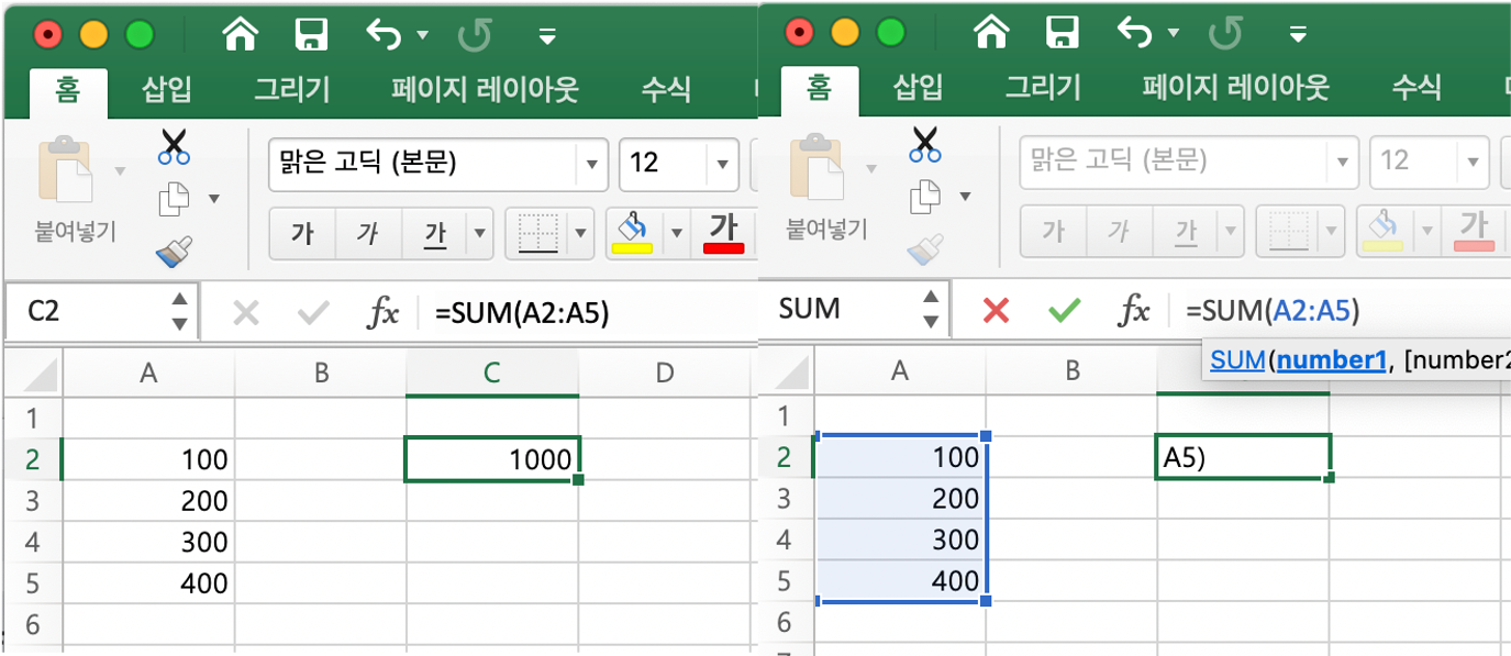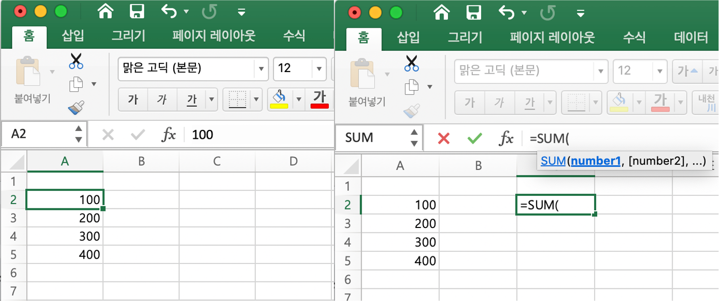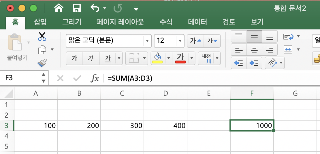단순히 =SUM(100, 200, 300, 400) 처럼 입력해도 되지만 그러면 함수를 사용했다 뿐이지