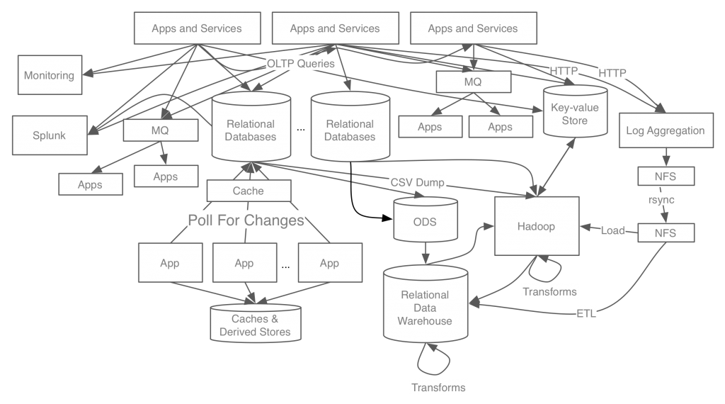 카프카는 링크드인에서 개발이 시작된 미들웨어입니다. 위의 그림은 링크드인이 맞이한 상황을 축약해놓은 것인데요.