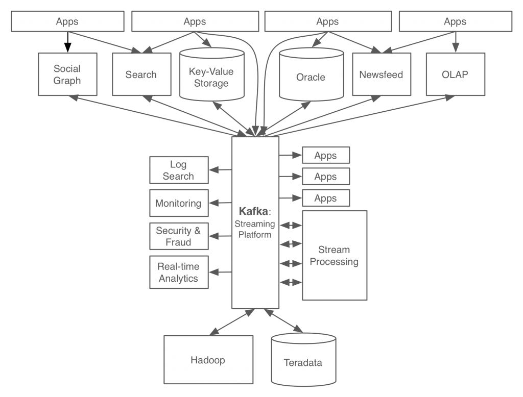 링크드인에서 제시한 위의 두 가지 용도로 사용되는 이벤트 스트리밍 플랫폼은 아래와 같은 구조를 갖도록 고안되었습니다.