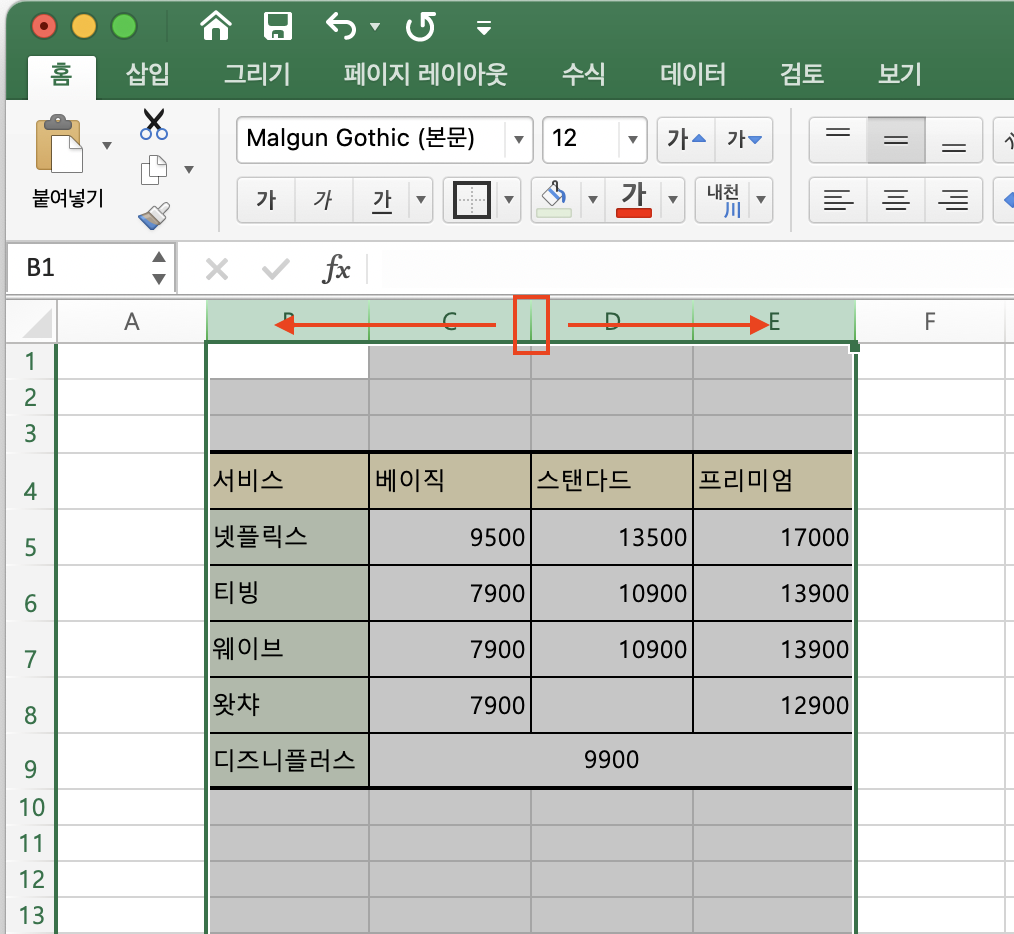 만일 셀의 너비를 조절하고 싶다고 한다면 아래처럼 늘리기를 원하는 열을 모두 선택해준 뒤에