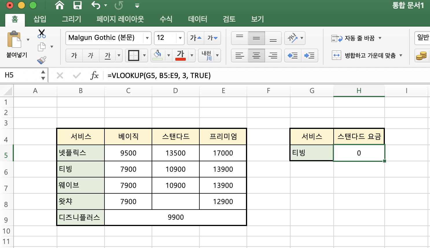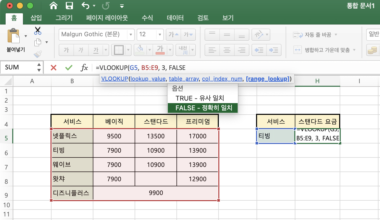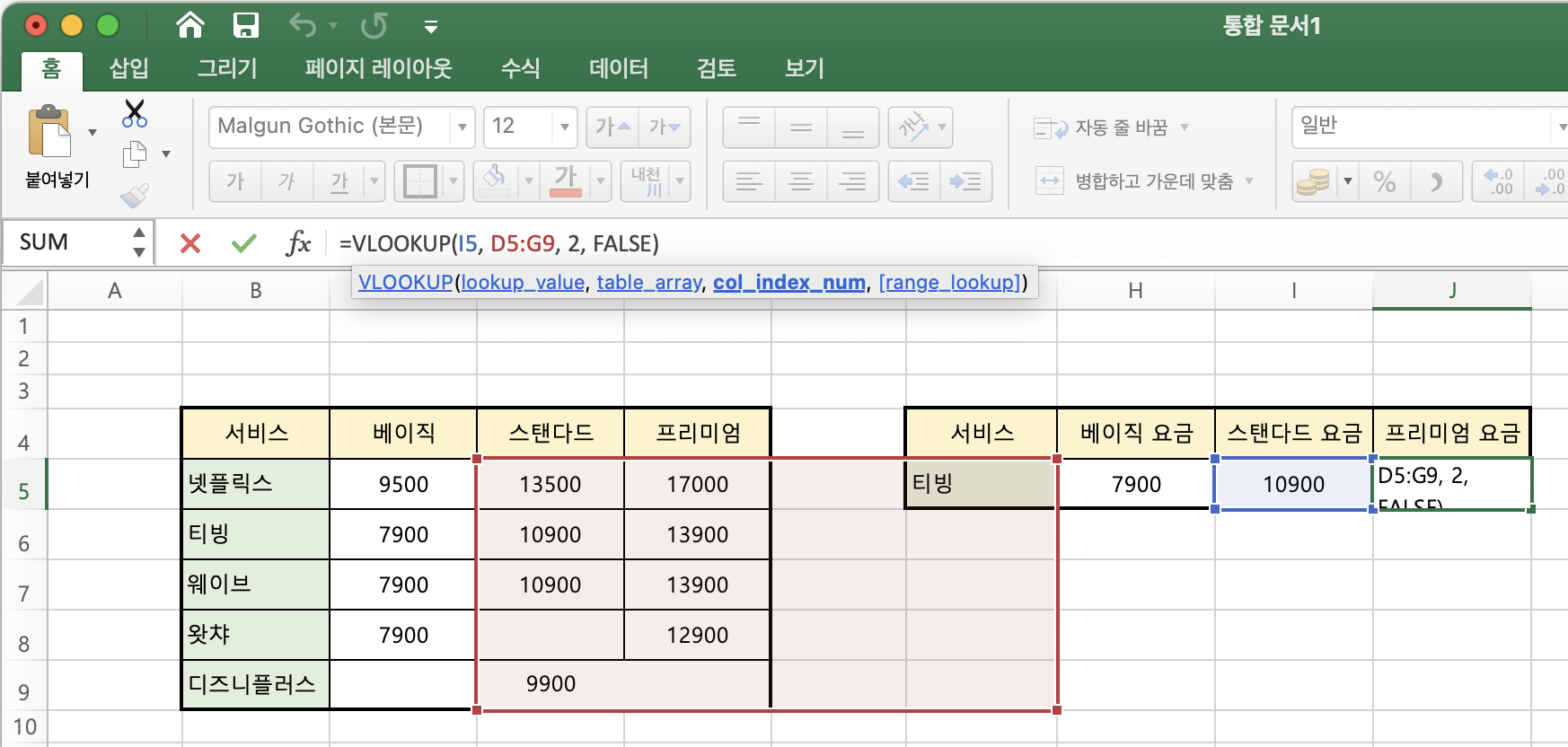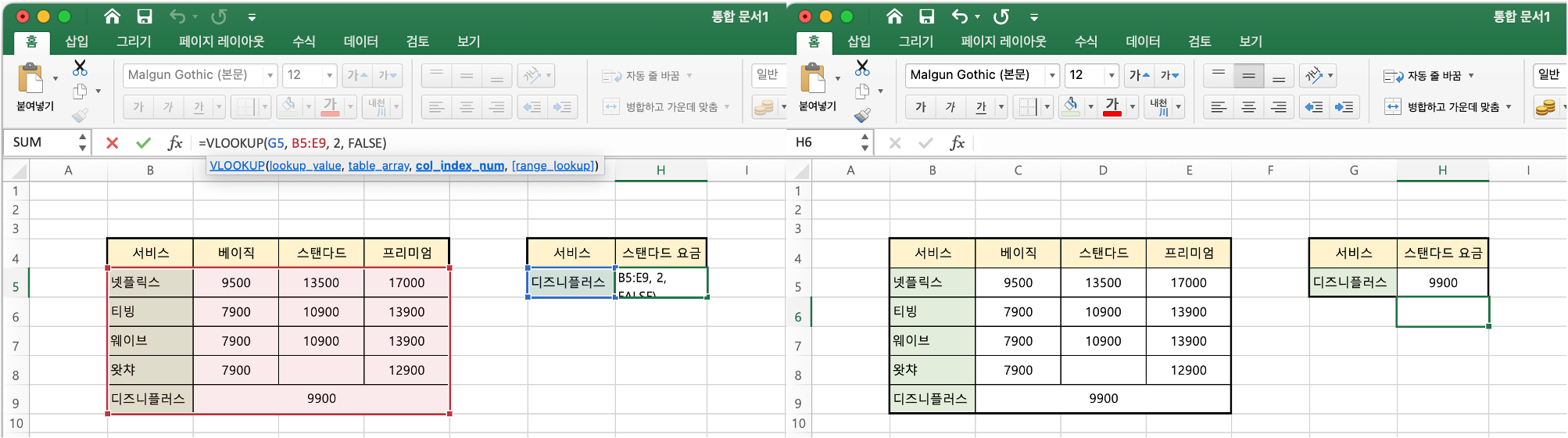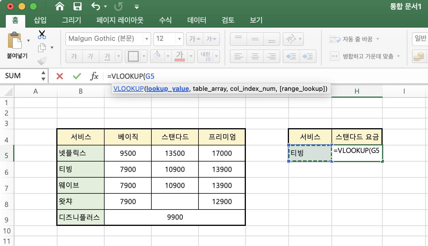 위 처럼 티빙 값이 입력 된 G5 주소를 입력해주어도 되고 직접 =VLOOKUP("티빙" 이라고 입력하셔도 됩니다.
