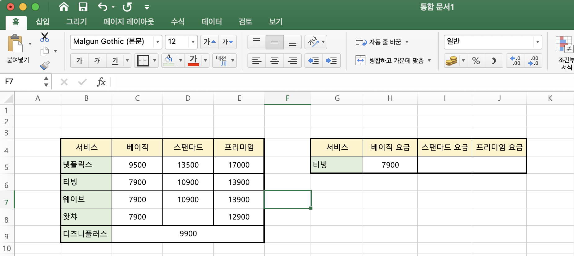 디즈니 플러스의 요금제 셀이 병합이 되어있었습니다!