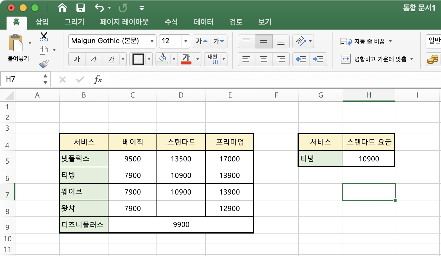 디즈니플러스의 스탠다드 열에 300 을 입력해주니까 H5 의 값이 300으로 변하는 것을 볼 수 있습니다.